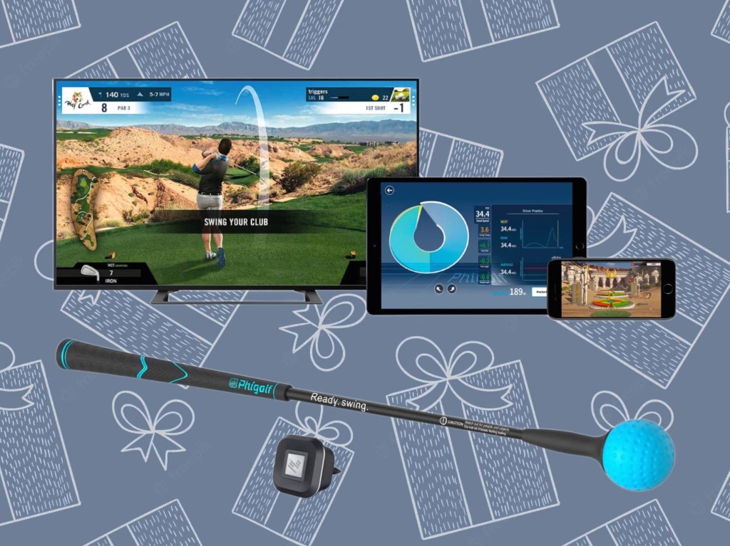 A home gold simulator! This gives him the ability to practice and analyze his swing anywhere, anytime. He will get live 3D feedback on head speed, swing tempo, club path, face angle, attack angle, and estimated distance. Phigolf also provides various forms of training programs, including swing analysis and putting-posture analysis.