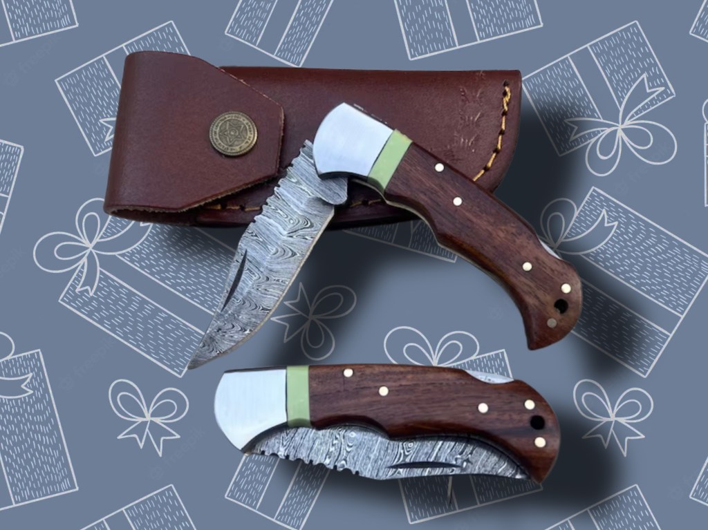 A Damascus Pocket Knife. This hand forged knife is absolutely stunning. You have so many options to personalize it too! Choose from 8 kinds of wood for the handle, and engrave the blade, the handle, or both! This is a folding pocket knife and comes with a leather sheath.